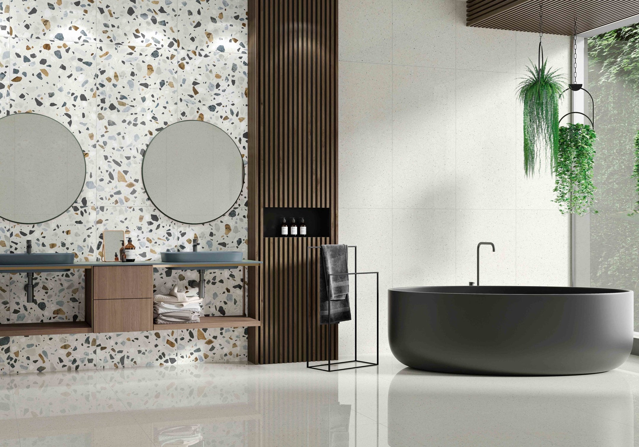The Crisp collection is inspired by modern terrazzo. Its matte finish, accented with small touches of brilliance in some places, gives a bright and natural design.
