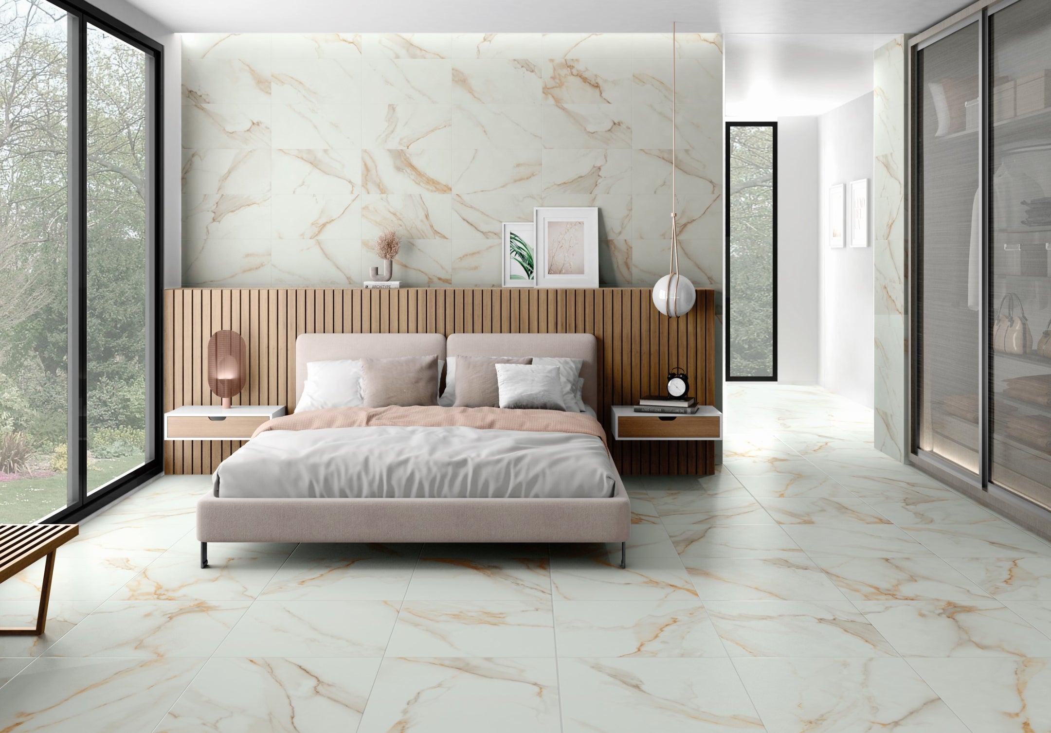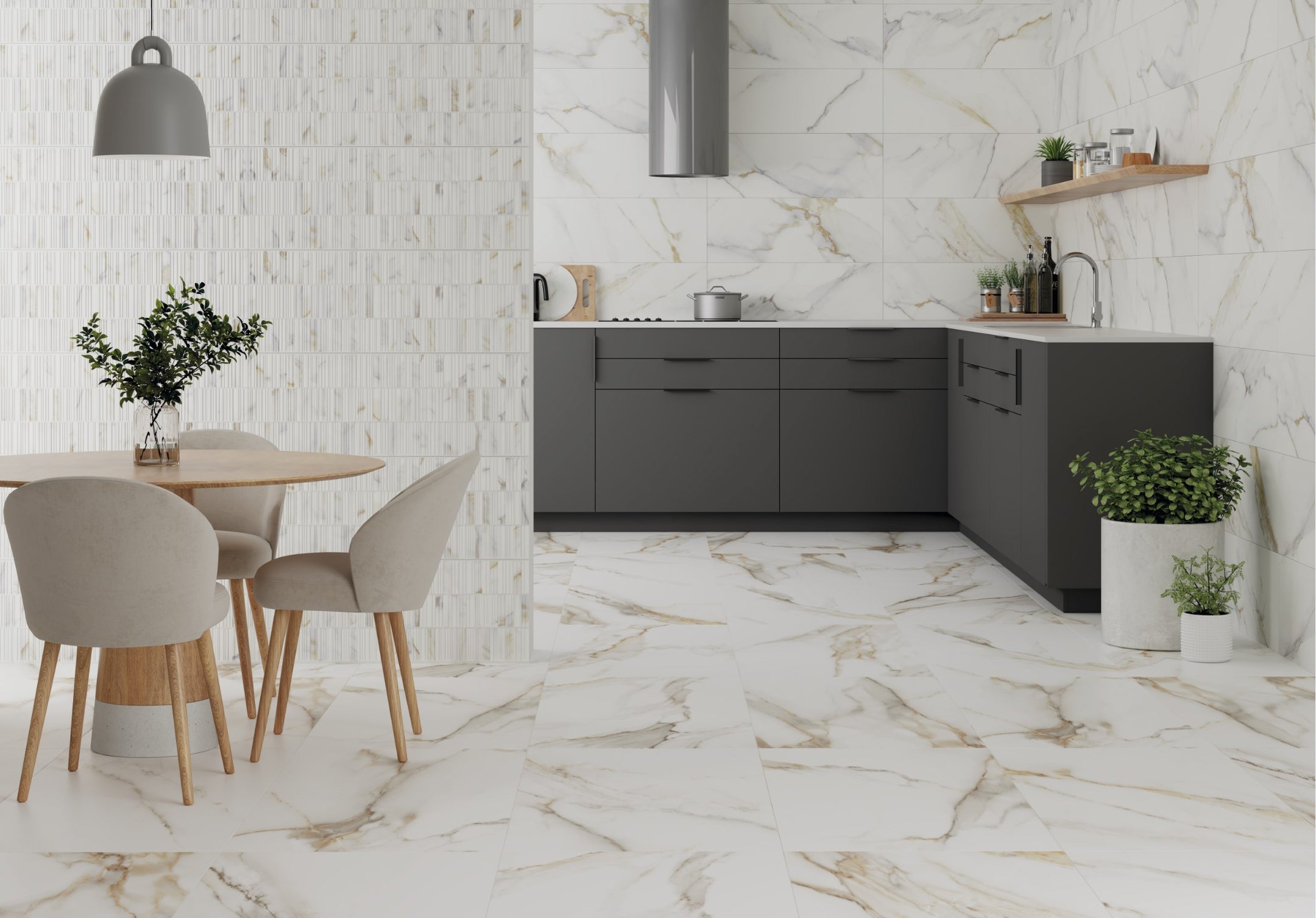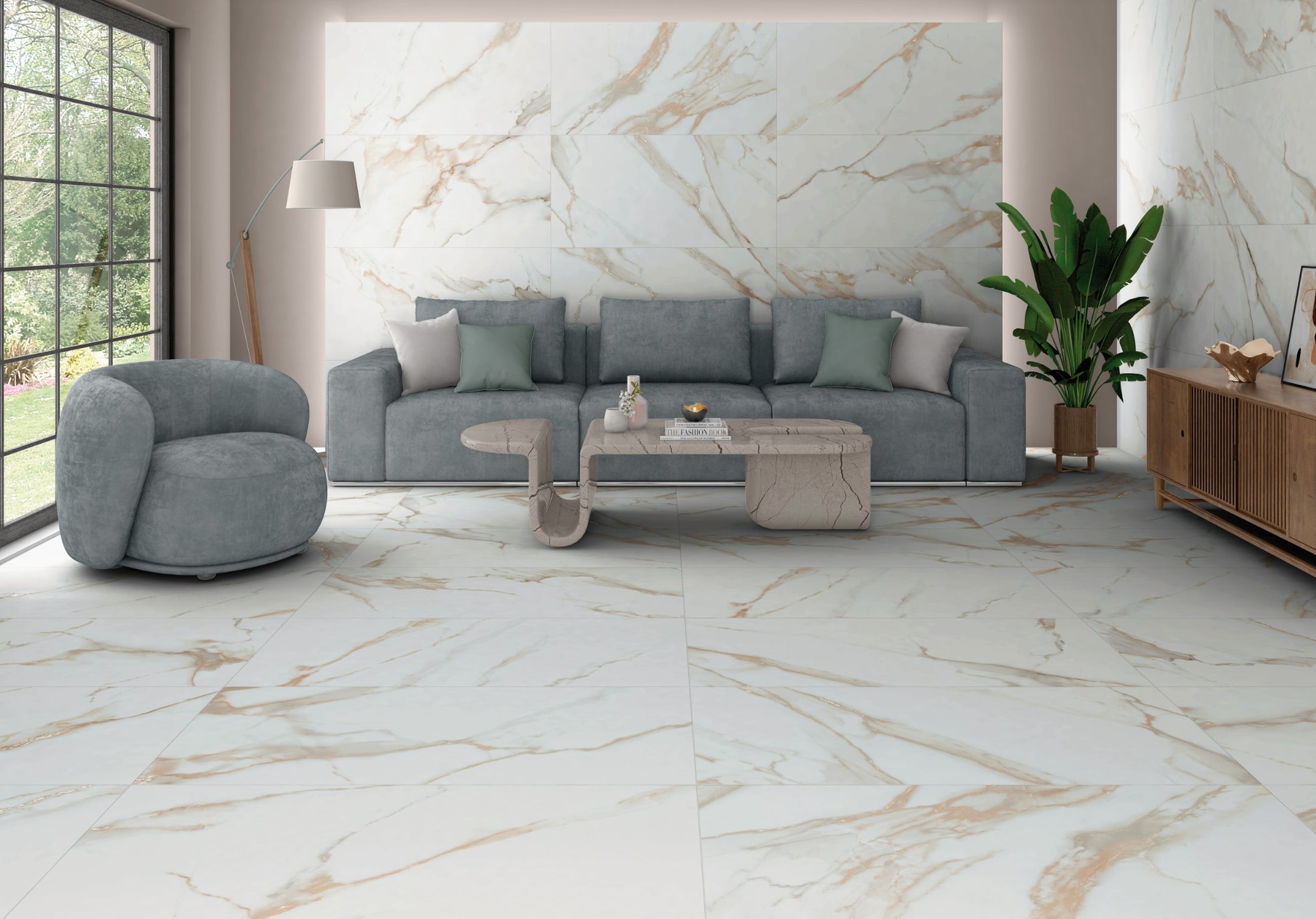 Un marbre au veinage gris et doré pour une ambiance chaleureuse, tout en restant sophistiquée. Cette porcelaine intemporelle s'harmonise parfaitement à tous les designs.